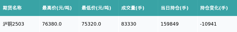 南方财经1月20日电,南财金融终端盘后期货数据显示,上海期货交易所的沪铜主力合约收跌1.28%,收盘报75400.0元/吨,日内资金流出9.18亿元。其他相关指标见下表: